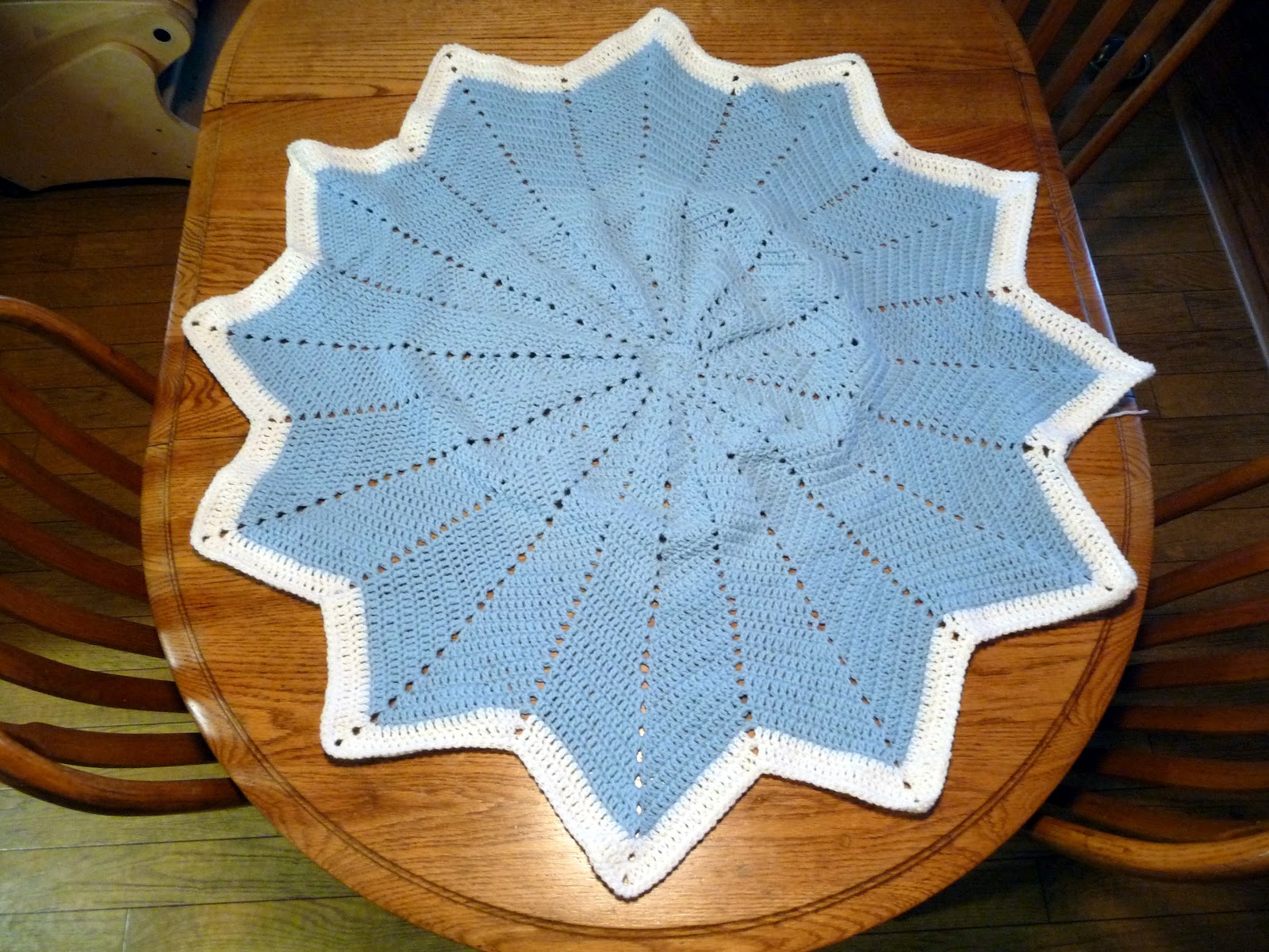 I finished up my baby afghan this morning. I'm not real happy with the 'pucker' in the middle. I'm hoping I can block that out. We'll see! The baby isn't due until November, so I have plenty of time to make some booties and a hat to go with it.